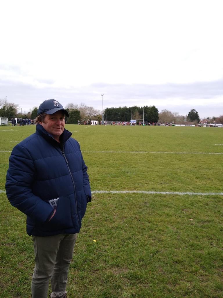 From there I went to stand behind the far posts and pass a few remarks with ‘Chairman Rugby Playing’, Steve Reynolds (above), as Combe scored another lovely try on the left wing. “Yes! That’s the bonus point”, came from Steve. He asked a player, “Still nervous?”, and the reply came back, “Not now. It’s good nerves. Channelled it.” More bluntly, as Colchester exerted perhaps their first pressure of the match, a player exhorted his team mates with the rallying call, “Right boys, let’s dig deep here. Let’s get f**king through it.” A disallowed Colchester try followed, then a fine finish for a first opposition try by one of the team’s Army contingent. Undaunted, an under the posts discussion as the conversion was attempted included another Combe rallying cry, “Let’s put another try on them before half time.” By then my companion Steve was getting a little nervous, “This ain’t over by a long shot”, he said as Colchester sought to exert themselves further. In a happier vein, soon he was to say, accurately, “Oh, we’re going to score here.” 34-7. But that one bonus point needed to be added to, and Steve revealed, “That means they’ve got to get to 41… it’s a good performance so far, a cracking performance.”