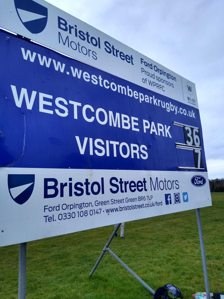 Rugby teams don’t consist of the relative waifs found on football pitches, and a favourite moment of the whole game was an early massive collision in centre field between two strapping lads vying to catch an up and under. With a thud that could be heard across the ground they met, at speed, and got up, slowly, slapped each others backs, and were looking about them just in time to see Westcombe Park’s first points go on the board through a penalty. 3-0 soon became 8-0 with the first try, and then 10-0. Then another try, 15-0, and I was soon to lose count, forgetting to consult the busy scoreboard near one set of posts. This was one-way traffic from a Westcombe side sensing the glory of a return to the national league, I was told, for the first time in a couple of decades. A missed conversion was followed by another try, and I had time to ponder just how high a standard of rugby was on view. It wasn’t just that the referee’s whistle, much-used for tries and conversions, sounded just like what you hear on the TV for international games, here were slick moves, high quality handling, and precise kicking. These players might not be the man-mountains to be found in the international game, but they can play.