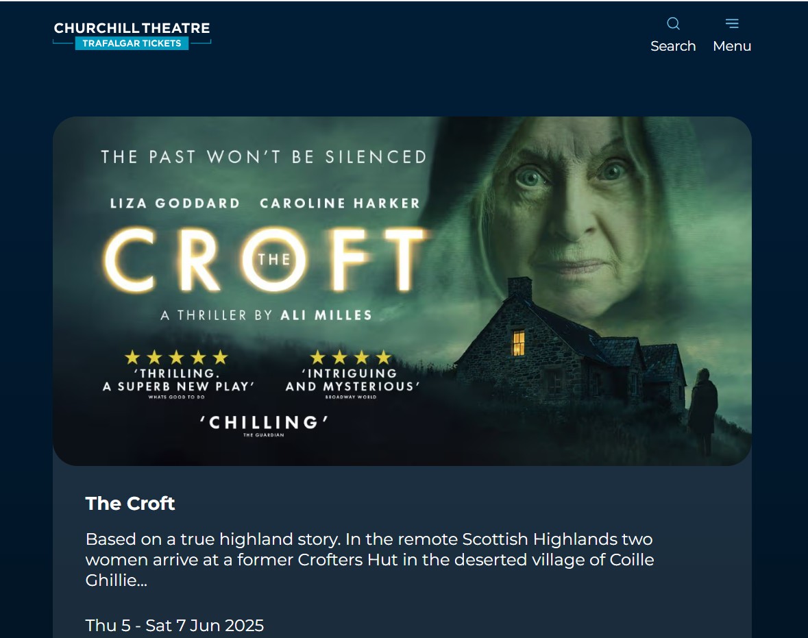 We despatched Mercedes Yearley of Quest Soul Theatre, herself an actress, to review The Croft, which is on between 5th and 7th June at Bromley’s Churchill Theatre. We previewed the show recently, here, and Mercedes clearly loved it, saying: